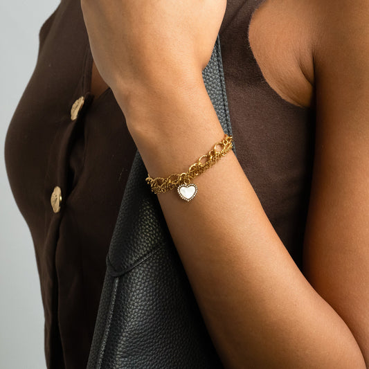 Radiating soft romance and sparkle, this heart-shaped charm features a lustrous pearl center framed by a delicate border of shimmering stones. Crafted from stainless steel with a rich 18K gold PVD finish, it’s designed to shine while resisting tarnish, water, and wear. We use the process of PVD Coating our...