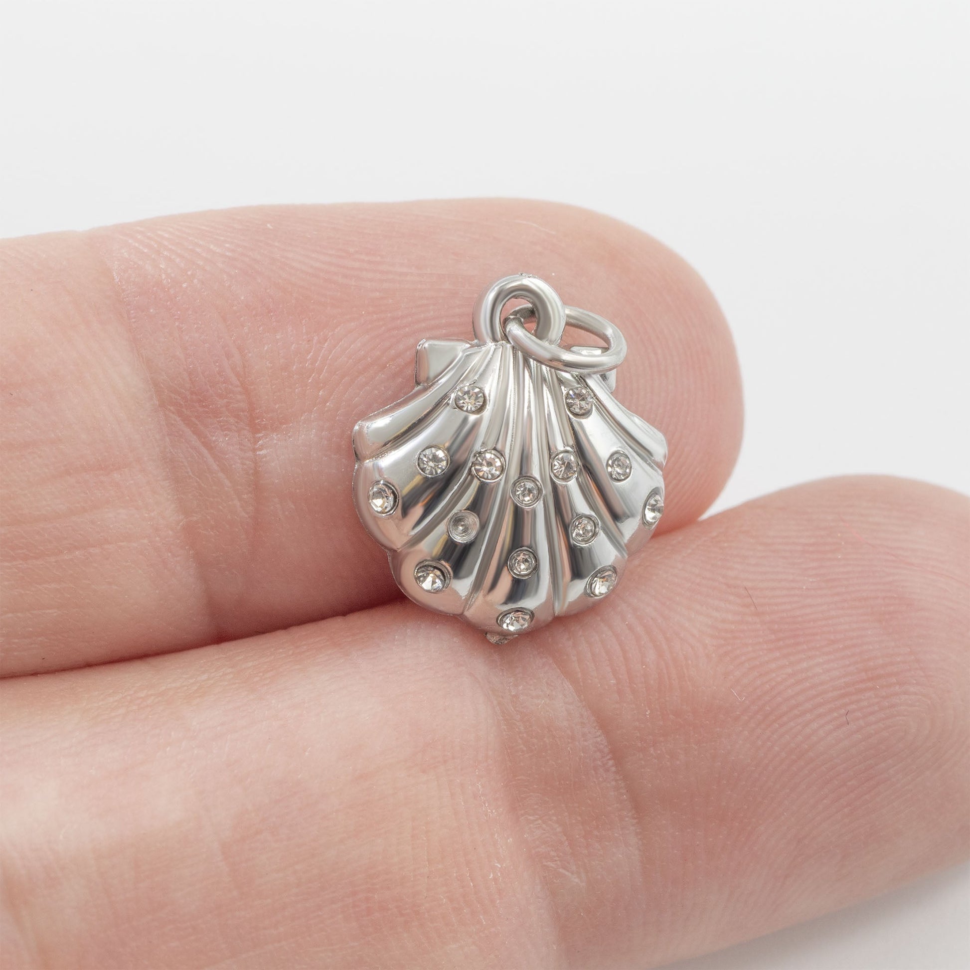 Coastal polish with lasting sparkle, this shell charm is dotted with hand‑set crystals and offered in two finishes—radiant 18K Gold PVD or classic Stainless—so it layers seamlessly with any jewelry. Crafted with a hypoallergenic stainless steel core for durability and tarnish‑resistant shine, it attaches in seconds with a secure lobster clasp and wears comfortably from day to night. Versatile and refined, it adds a marine‑inspired touch to casual looks and elevates dressier outfits with a subtle shimmer.